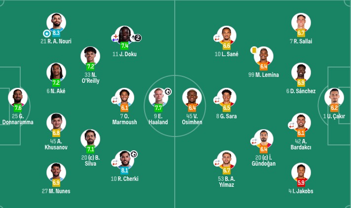 曼城出场阵容:25-多纳鲁马、6-阿克、21-努里、27-努内斯、45-胡桑诺夫、33-奥赖利、20-B席、10-谢尔基(82’14-尼科·冈萨雷斯)、7-马尔穆什(67’4-赖因德斯)、9-哈兰德、11-多库(37’47-福登)